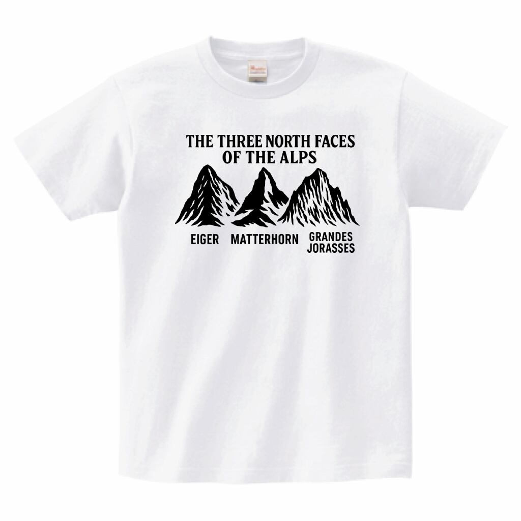 アルプス三大北壁Tシャツは、アイガー、マッターホルン、グランド・ジョラスの美しいシルエットを描いたデザインが魅力的な一枚です。登山やアウトドアを愛する方々にぴったりで、山々の神秘的な姿を身近に感じられるアイテムです。柔らかなコットン素材を使用しており、肌触りも優れていますので、快適に着用できます。